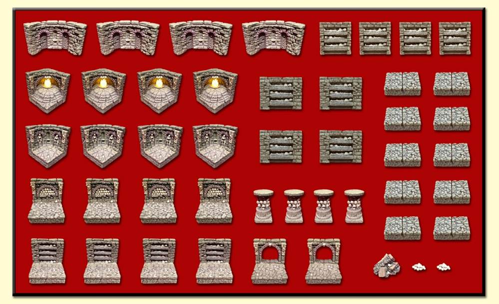 There are some new types of pieces available in this set. For the first time ever, we have battery-operated, flickering orange LED lights “flames” burning in four Corner Wall pieces. The effect is amazing in a darkened room! We have also included eight freestanding walls in this set to allow GMs ultimate control of their set-ups.