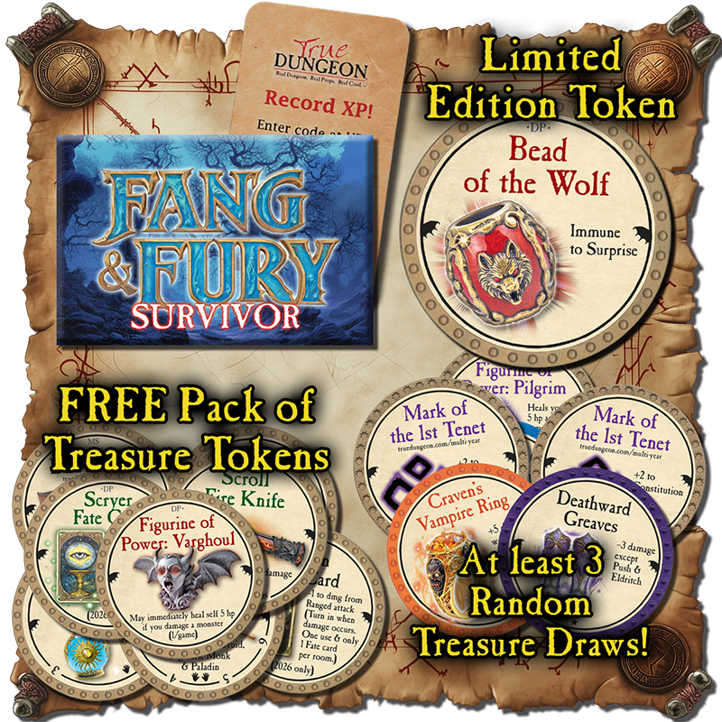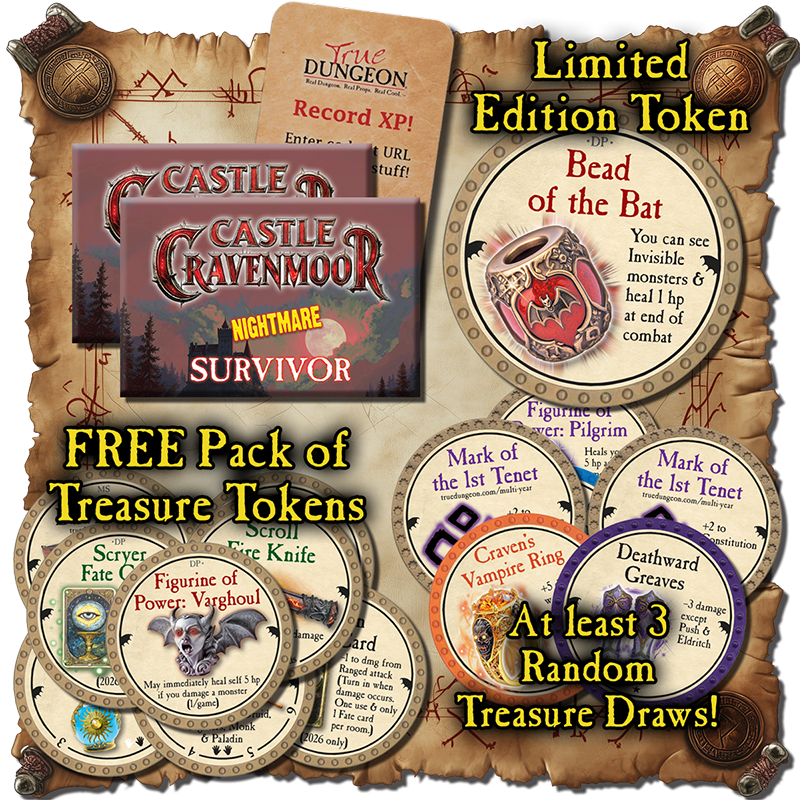As stated earlier, players earn cool free swag. This includes a free pack of Treasure Tokens, at least three random Treasure Tokens as loot (at the end of the adventure), a unique XP code to start earning level benefits, and a limited edition Participation token just for playing a TD adventure. Each event for Gen Con 2026 has a unique Participation token that will be awarded to players regardless of level of difficulty. There are also unique Survival buttons available for each adventure: one for Normal/Hardcore and another for Nightmare/Epic. Anyone playing on the "Non-Lethal" setting will receive a Participation token, but no Survival button can be earned on "Non-Lethal" difficulty.
