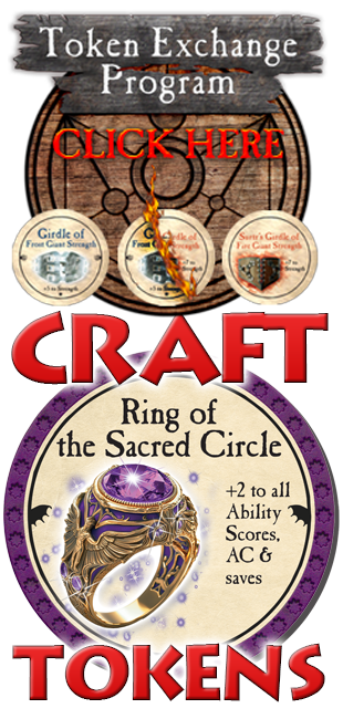 Pack of 10 2026 Treasure Tokens![]() Each highly collectible Treasure Token ten-pack comes in a velveteen pouch and includes 7 Common, 2 Uncommon, and 1 Rare token. Because we are big old-school D&D geeks and we love to roll up treasure, we decided to simulate getting a "00" result while rolling up treasure. One out of 100 token bags contains 6 Common, 2 Uncommon, 1 Rare, and 1 Ultra Rare token! Finally, one random token in each ten-pack is guaranteed to have a "platinum" back instead of the standard gold back. |