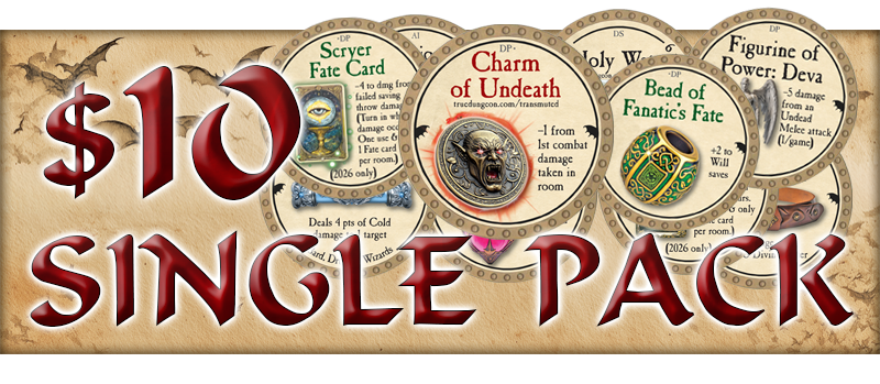 Pack of 10 2026 Treasure Tokens![]() Each highly collectible Treasure Token ten-pack comes in a velveteen pouch and includes 7 Common, 2 Uncommon, and 1 Rare token. Because we are big old-school D&D geeks and we love to roll up treasure, we decided to simulate getting a "00" result while rolling up treasure. One out of 100 token bags contains 6 Common, 2 Uncommon, 1 Rare, and 1 Ultra Rare token! Finally, one random token in each ten-pack is guaranteed to have a "platinum" back instead of the standard gold back. |