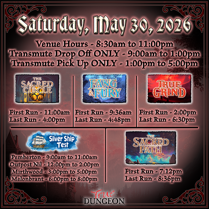 Yes. They are all on Saturday. These slots marked as “Family Friendly” have tickets that should only be bought by an adult who is bringing along one or more children under 13 years of age. The 10:00am slot of Fang & Fury, the 2:00pm slot of The Sacred Circle, and the 7:00pm slot of The Sacred Path will be marked as Family Friendly. Additional slots may be designated as such depending on demand. - For The Sacred Circle run, will players sign up for our classes prior to the event?